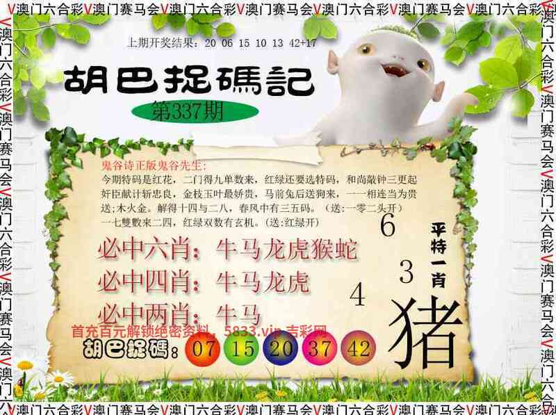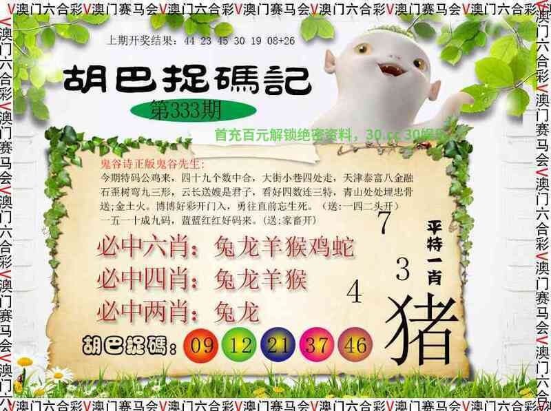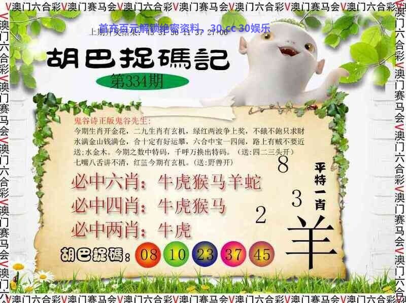 ╠解胡巴抓码记╣336期:今期生肖二三头,五尘四四马先去,蓝绿特码大数定,猜中单双有横财一本万利四五来,林中高手王中王,特码今期看细数,珠光宝气一身新送;木土火。今期生肖九字头,除红取绿大有财。(送:三零二头开)一三告知一九根,绿波有特兼防红。(送:单数开) |
